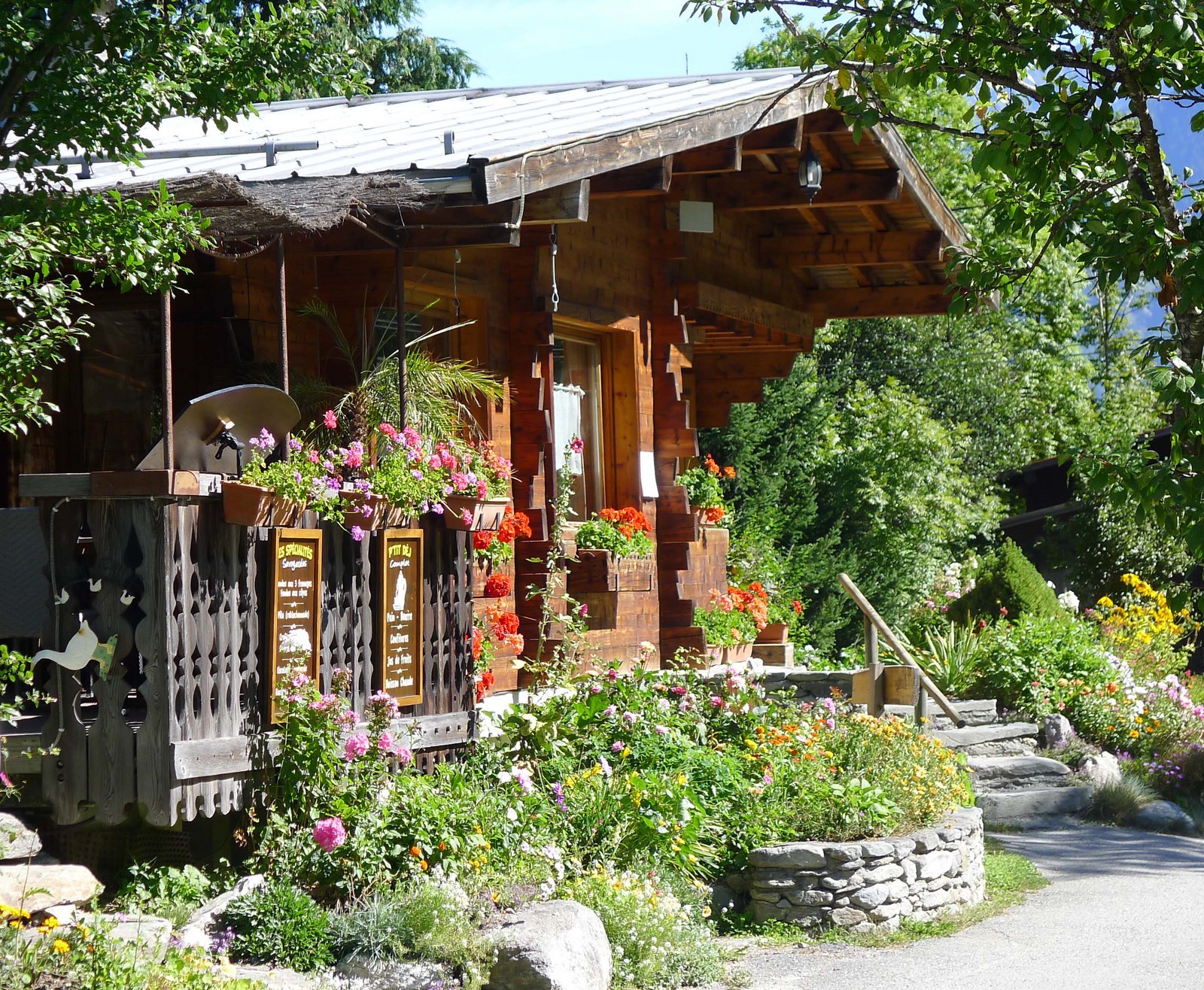 Le invitamos a disfrutar de nuestra terraza cubierta y decorada con flores en verano. Tambien hay el comedor interior con estilo alpino muy comodo.